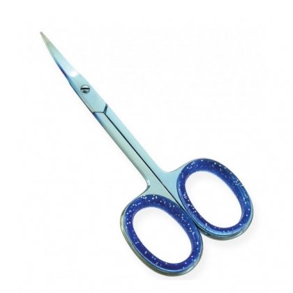 Available Sizes. 3 inches All scissors are made of superior quality stainless steel 410, HRC (hardness) 45 – 48. Available in Blister Packing, Pouches and Plastic Bags. Nail Scissors Blue Titanium coated, Adjustable Screw, Curved